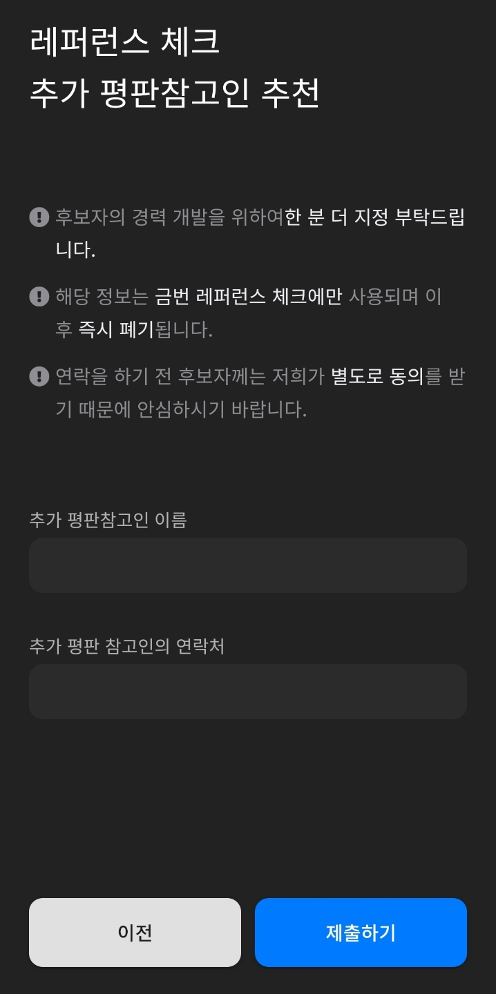 이렇게 기나긴 항목을 작성하고 나면 비지정 레퍼런스 체크라면서 추가 평판 참고인을 작성하라고한다더군요.